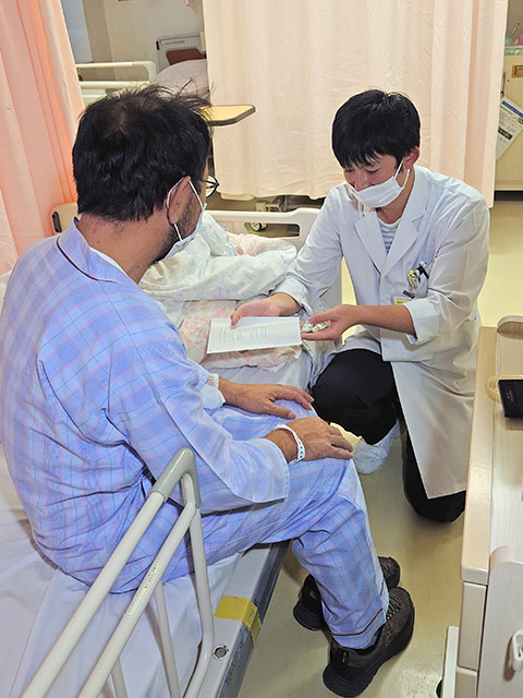 安全で効果的な薬物療法が行えるよう、入院患者さんの薬剤の使用歴や持参薬、副作用歴、アレルギー歴等を確認し、そのうえで患者さんのベッドサイドに直接出向いて、使用する薬剤について、効果や飲み方、自己注射薬や吸入薬の使用方法、注意事項等を説明しています。また、薬の効果や副作用等のモニタリングを行い、医師への処方提案や患者さんからの質問や相談にもお答えしています。